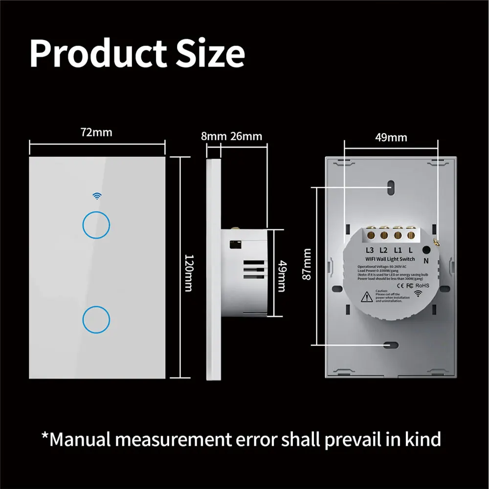 5.Safety and Certification:The wall switch adopts premium materials, such as fire-resistant shell, phosphor bronze connects and advanced PC+TEMPERED GLASS, can provide fire prevention, overload protection to protect your family.